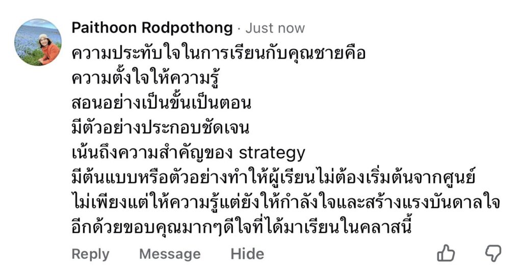 นี่คือคอร์ส Brand New คือยังไม่เคยเปิดเผยมาก่อน แต่ลองฟังนักเรียนที่เคยลงเรียนในคลาสอื่นๆกับผมว่าเขาพูดถึงการเรียนกับผมอย่างไรกันบ้าง